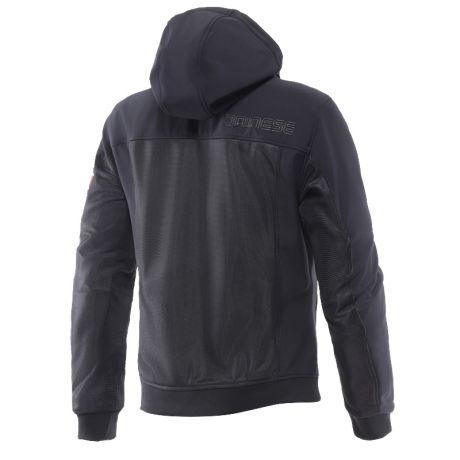 Giacca da moto da uomo con cappuccio, realizzata in morbido tessuto Softshell e dotata di ampie pannellature in mesh, progettata per garantire massima ventilazione e comfort nelle giornate più calde.