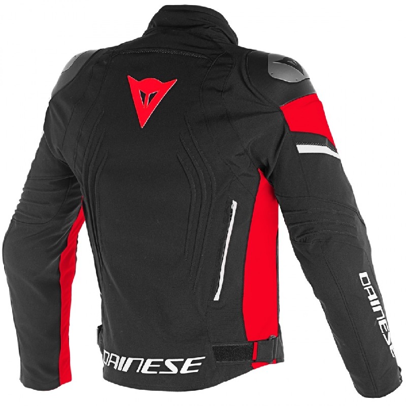 Giacca Dainese Racing 3 D-Dry sportiva con membrana impermeabile, tessuto Cordura e piastre in alluminio sulle spalle. Ideale per uso stradale per il motociclista sportivo.CARATTERISTICHE-Prese d'aria sulle spalle, maniche e schiena-Fodera con membrana incorporata D-Dry e fodera termica rimovibile-Protezioni composite removibili certificate secondo EN 1621.1 Standard sui gomiti, spalle (1876165 kit in alluminio spalla sportivo)-Spalle termoformate rivestite in pelle -Cordura e alluminio-Sistema di unione giacca pantalone-Posteriore più lungo-Giacca Dainese Racing 3 D-Dry in microelastico 2.0-Regolazione collo, vita e polsi.-Prese d'aria su petto e schiena e maniche-Tessuto esterno con trattamento resistente all'acqua-Fermo anteriore Idraflap-2 tasche anteriori 2 tasche interne 2 tasche sulla fodera rimovibile-Tasca per protezione opzionale Double Chest (venduta separatamente)-Tasca per protezione posteriore G1 o G2 opzionale (venduta separatamente)-Inserti reflex alta visibilità